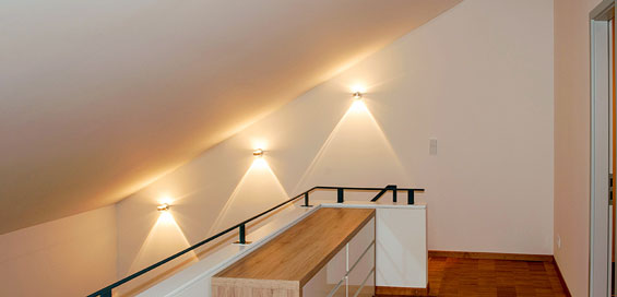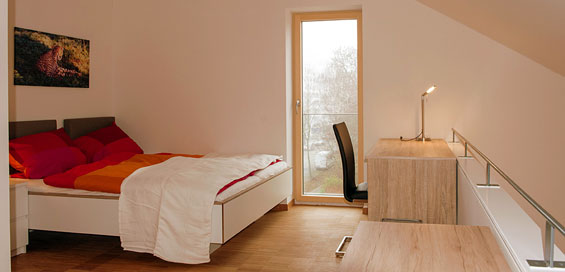 - Separater Schlafbereich mit Doppelbett, Bettwäsche und Arbeitsbereich mit Schreibtisch und Staufächern auf der Galerie.